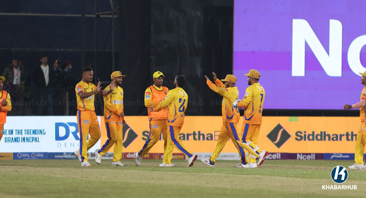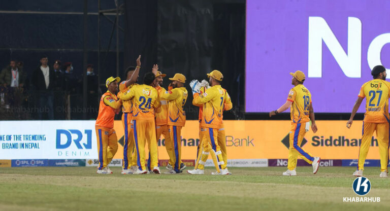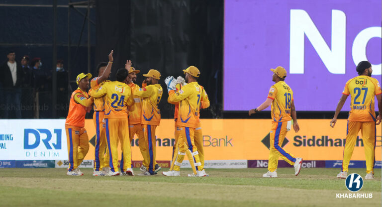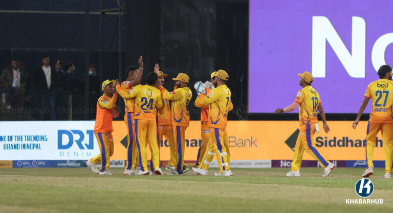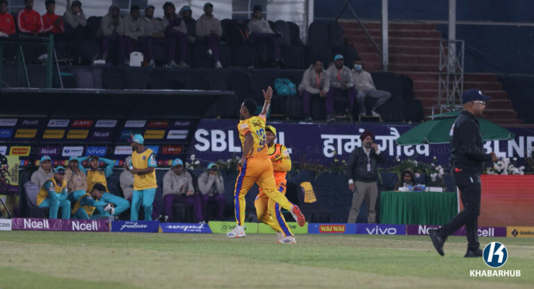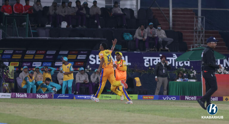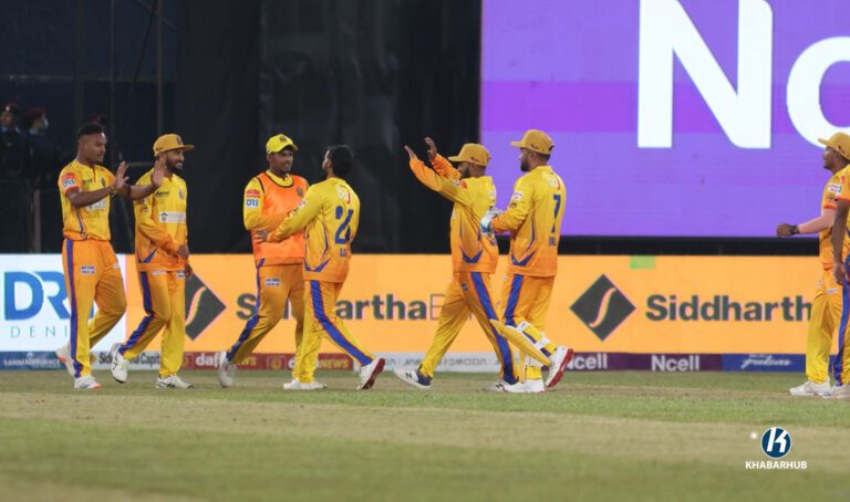 ११ ओभरको अन्तिम दुई बलमा लगालग दुई विकेट गुमेपछि काठमाडौं संकटमा पुगेको हो । १२ ओभरमा खेल पुग्दा काठमाडौं ६ विकेटको क्षतिमा ९६ रनको अवस्थामा छ ।