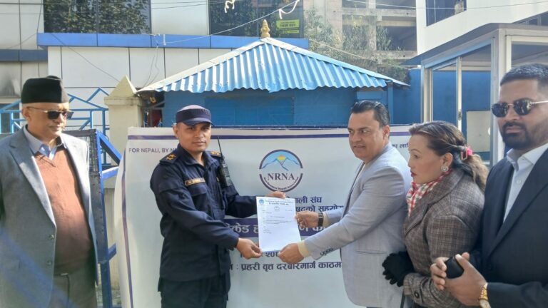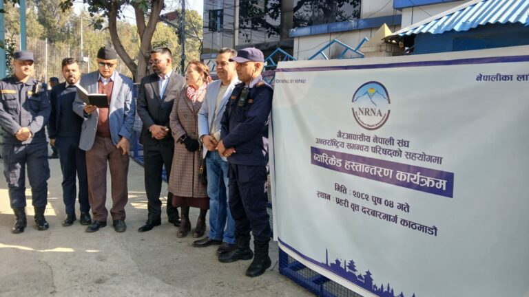 काठमाडौं– गैरआवासीय नेपाली संघ (एनआरएनए)ले नेपाल प्रहरीको दरबारमार्ग स्थित प्रहरी वृत्तलाई १० थान ‘ब्यारिकेड’ हस्तान्तरण गरेको छ ।