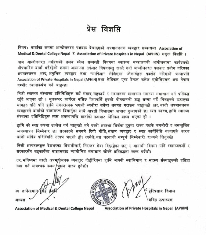 तर, उनीहरूले भविष्यमा यस्ता अपमानजनक व्यवहार दोहोरिएमा आफ्नो स्वाभिमान र सदस्य संस्थाहरूको प्रतिष्ठा जोगाउन आवश्यक कदम चाल्न बाध्य हुने चेतावनी दिएका छन् । संयुक्त विज्ञप्तिमा मेडिकल कलेजहरूका तर्फबाट अध्यक्ष डा. ज्ञानेन्द्रमान सिंह कार्की र अफिनका तर्फबाट उपाध्यक्ष हरिप्रसाद रिजालले हस्ताक्षर छन् ।