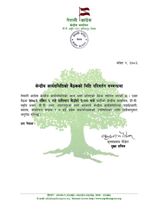 कांग्रेस पार्टी मुख्यसचिव कृष्णप्रसाद पौडेलले आज एक सूचना जारी गर्दै आजका लागि बोलाइएको बैठक आगामी शनिबार दिउँसो १ बजे बस्ने गरी सारिएकाे जनाएका छन् ।