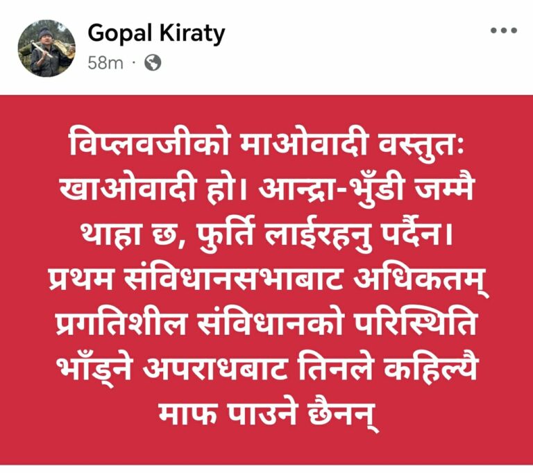 ुविचार र राजनीति फरक भए पनि गोपाल किरातीलाई म सम्मान गर्दै आएको थिएँ। तर उहाँको पछिल्लो स्टाटसले राजनीतिक बुझाइ निकै तल झरेको देखायोु, उनले भने, ुखाओवादी को हो भनेर १, २, ३ गर्नुपर्ने अवस्था छैन। आन्द्रा–भुँडी मात्र होइन, तपाईँको पित्त थैलीसम्म थाहा छ हामीलाई। प्रिय बन्नु छ भने किन हैसियत बिर्सेर यति तल झर्नु हुन्छ ? नझर्नुस् भन्ने सुझाव बाहेक अरू केही छैन।ु