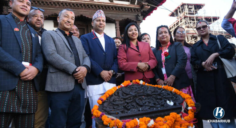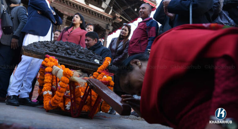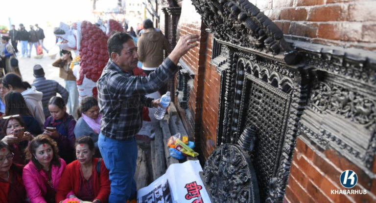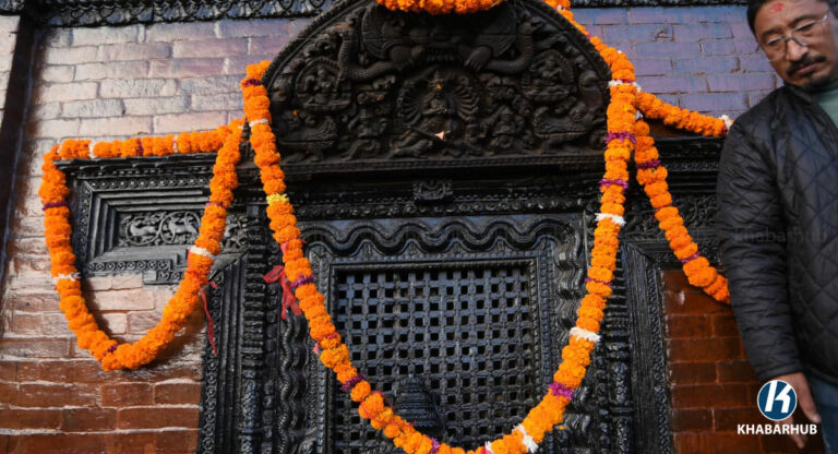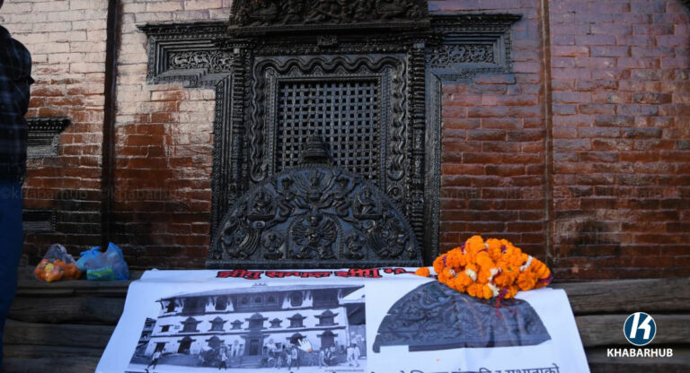 बाजा बजाएर पूजा गरेपछि कुमारी घरको मुख्य ढोकाको दायाँपट्टि रहेको झ्यालमाथिको उक्त तोरण पुनर्स्थापना गरिएको छ।