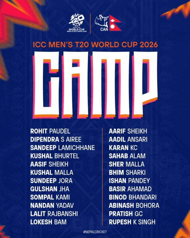 काठमाडौं – आगामी फेब्रुअरी ७ देखि मार्च ८ तारिखसम्म भारत र श्रीलङ्कामा संयुक्त रूपमा आयोजना हुने आइसिसी टी–२० विश्वकप क्रिकेट २०२६ का लागि नेपाली क्रिकेट टोलीको प्रारम्भिक चरणमा २४ खेलाडी छनोट भएका छन् ।