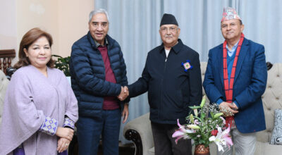 काठमाडौं- सिंहदरबारमा प्रधानमन्त्री सुशीला कार्कीले आयोजना गरेको सर्वपक्षीय छलफल चलिरहँदा नेकपा एमालेका अध्यक्ष केपी शर्मा ओली नेपाली कांग्रेसका सभापति शेरबहादुर देउवालाई भेट्न महाराजगञ्ज पुगेका छन् । एघारौँ महाधिवेशनबाट निर्वाचित सचिव महेश बस्नेतलाई सिंहदरबारको बैठकमा पठाएर राजनीतिक सन्देश दिएका ओलीले महाराजगञ्ज जाँदा पनि महासचिव शंकर पोखरेल साथमा देखिए । कांग्रेस र एमालेका बहुमत अर्थात् १३९ जना … Continue reading महेशलाई सिंहदरबार पठाएका केपी साथमा शंकर लिएर पुगे शेरबहादुर भेट्न