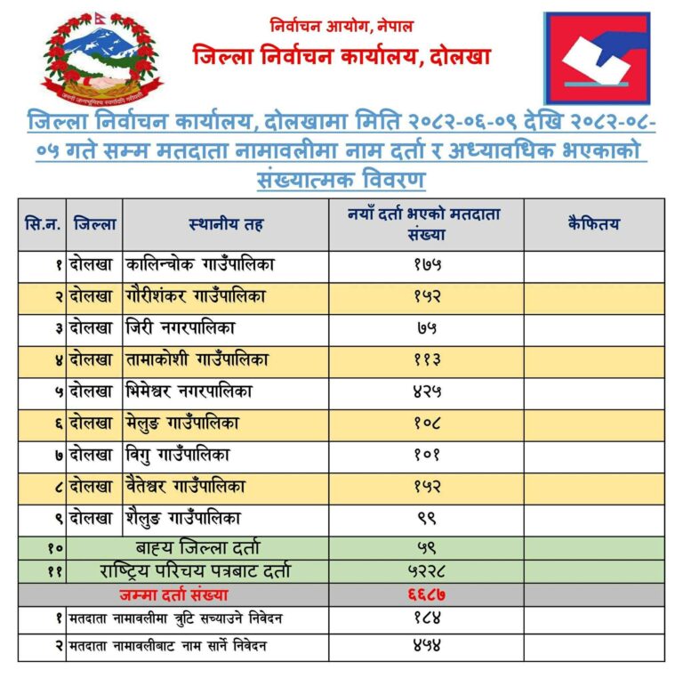 जिल्ला निर्वाचन कार्यालय दोलखाको पछिल्लो दुई महिनाको तथ्यांकअनुसार असोज ९गतेदेखि मंसिर ५ गतेसम्म  ६ हजार ६सय ८७ जनाले मतदाता नामावलीमा नाम दर्ता गरेका हुन् ।