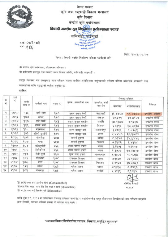 केन्द्रीय कृषि प्रयोगशालाले कालीमाटी तरकारी बजारका १५ पसलको १५ थरी तरकारी तथा फलफूल परीक्षण गरेकोमा रायोको सागमा उक्त मात्रामा विषादी भेटिएको हो । विषादीको मात्रा धेरै भेटिएको उक्त रायोको साग उपभोग गर्न पूर्ण अयोग्य रहेको जनाइएको छ ।