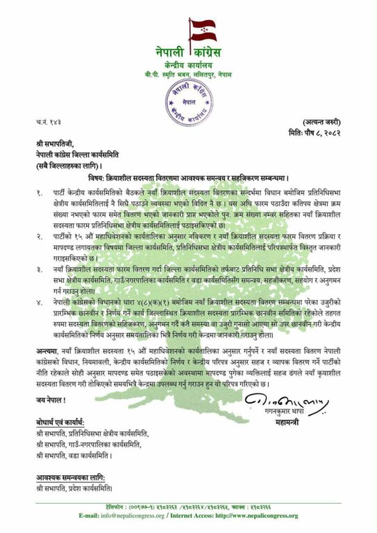 थापाले जारी गरिएको परिपत्रमा ‘नयाँ क्रियाशील सदस्यता १५औँ महाधिवेशनको कार्यतालिकाअनुसार गर्नुपर्ने र नयाँ सदस्यता वितरण नेपाली कांग्रेसको विधान, नियमावली, केन्द्रीय कार्यसमितिको निर्णय र केन्द्रीय परिपत्रअनुसार सहज र व्यापक वितरण गर्ने पार्टीको नीति रहेकाले सोहीअनुसार मापदण्ड समेत पठाइसकेको’ भनिएको छ ।