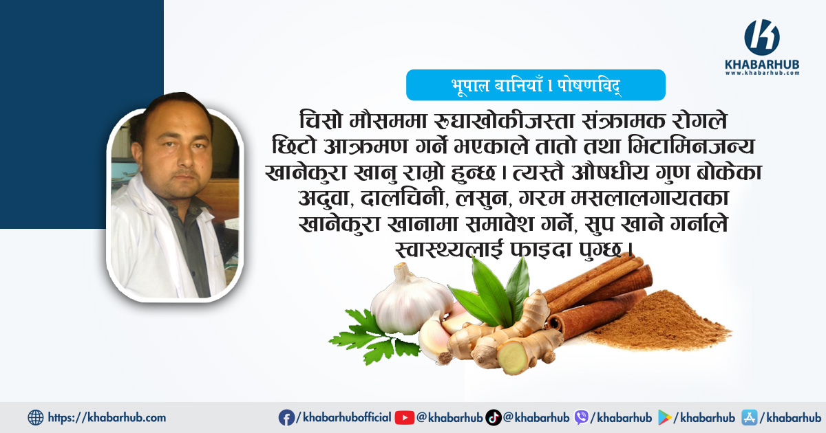 चिसो मौसममा कस्तो खाना खाने ? चिसो मौसममा पानी कति खानुपर्ने हो ? सबै कुरा तातो मात्रै खाँदा पनि स्वास्थ्यमा असर पुग्ने हो कि यिनै विषयमा पोषणविद् भूपाल बानियाँसंग गरिएको कुराकानीः