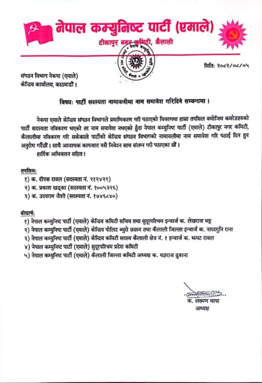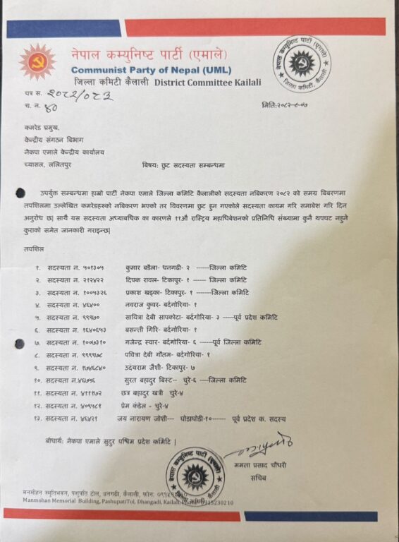 पत्रमा एमाले जिल्ला कमिटी कैलालीको सदस्यता नवीकरण २०८२ को समग्र विवरणमा छुटेको भन्दै थप्न भनिएको छ। छानबिन समिति गठन भएको सन्दर्भमा जिल्ला कमिटीले नवीकरण भएर पनि विवरणमा छुट हुन गएको भन्दै सदस्यता कायम गरी समावेश गरिदिन १३ जनाको नाम पठाएको छ ।