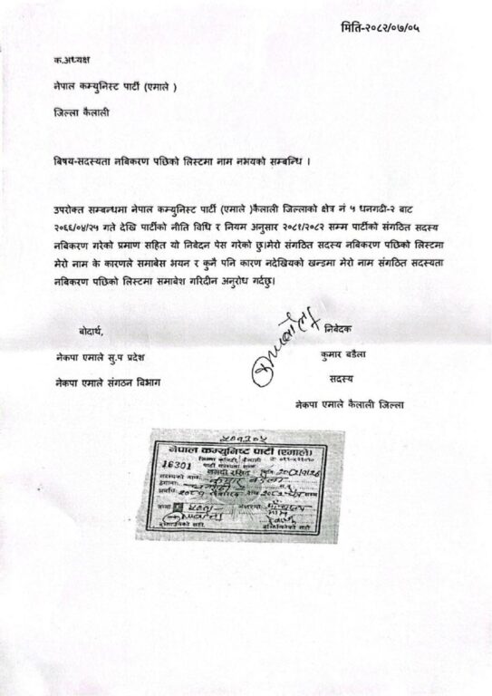 उता कुमार बडैलाले पनि नवीकरण गरिसकेको अवस्थामा पनि आफ्नो संगठित सदस्यता नियतवश छुटाइएको भन्दै जिल्ला कमिटीमा निवेदन दिएका छन्
