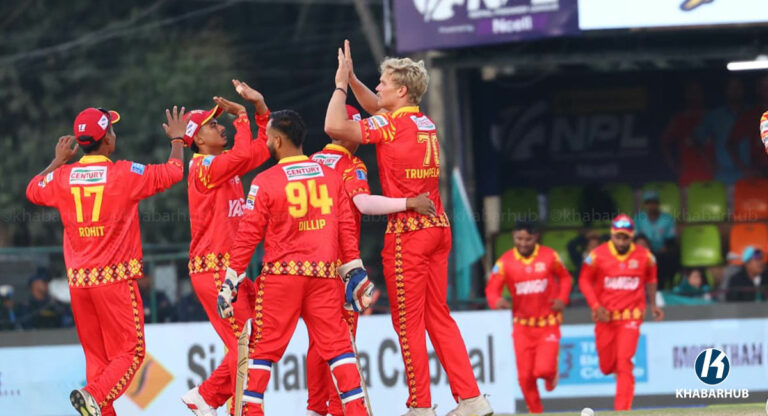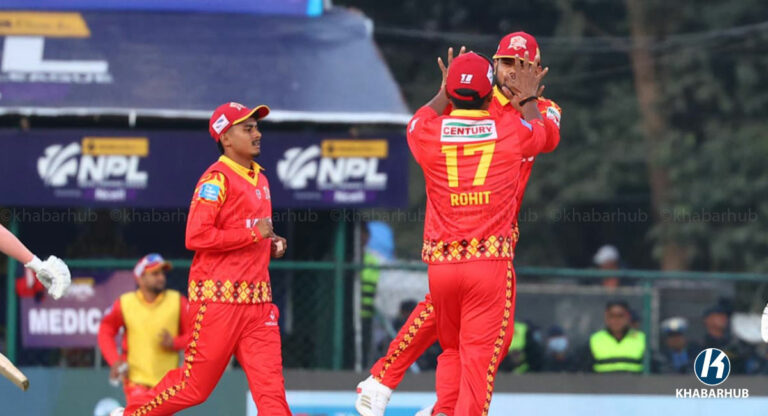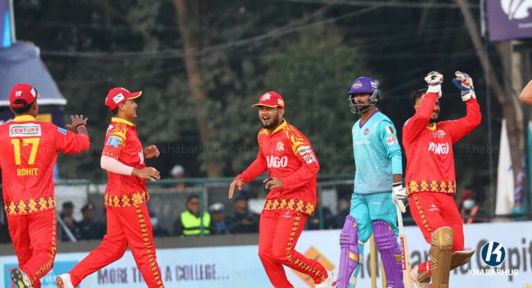 ११ ओभरको अन्तिम बलमा ७३ रनको दयनीय अवस्थामा काठमाडौंले पाँच महत्त्वपूर्ण ब्याटरलाई गुमाएको हो ।