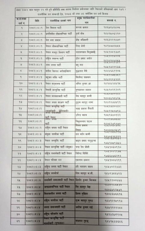 काठमाडौँ- फागुन २१ गते तोकिएको प्रतिनिधिसभा निर्वाचन प्रयोजनका लागि निर्वाचन आयोगमा ८० दल दर्ता भएका छन्।