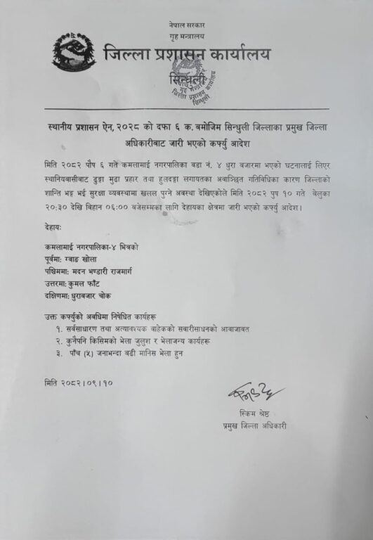 सिन्धुली – जिल्ला प्रशासन कार्यालय सिन्धुलीले कमलामाई नगरपालिका क्षेत्रमा अवस्था तनावग्रस्त बनेपछि कर्फ्यू आदेश जारी गरेको छ।