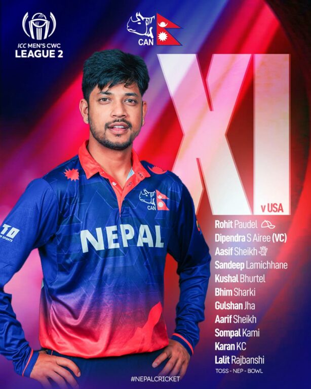 नेपाली टिममा कप्तान पौडेल, उपकप्तान दीपेन्द्रसिंह ऐरी, अनिल शाह, सन्दीप लामिछाने, आसिफ शेख, कुशल भुर्तेल, सोमपाल कामी, करण केसी नन्दन यादव, भीम सार्की, कुशल मल्ल, आरिफ शेख, ललित राजवंशी, गुलशन झा र शाहब आलमले स्थान पाएका छन्।