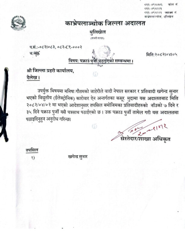 अदालतको दायरी शाखाबाट २०८२ साउन ५ गते जारी पत्रअनुसार अधिवक्ता मनिषा गौतमको जाहेरीका आधारमा नेपाल सरकार वादी र खगेन्द्र सुनार प्रतिवादी रहने गरी मुद्दा दर्ता भएको थियो ।