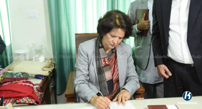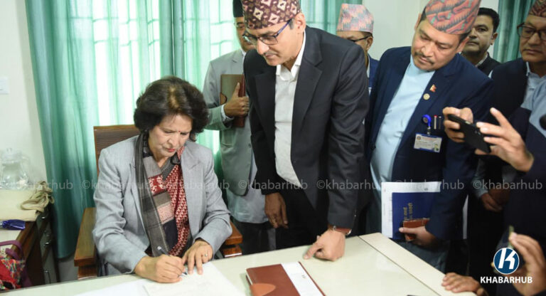 काठमाडौं- नवनियुक्त स्वास्थ्यमन्त्री डा. सुधा शर्माले शपथ लिएपछि स्वास्थ्य मन्त्रालयमा पदभार ग्रहण गरेकी छिन् ।