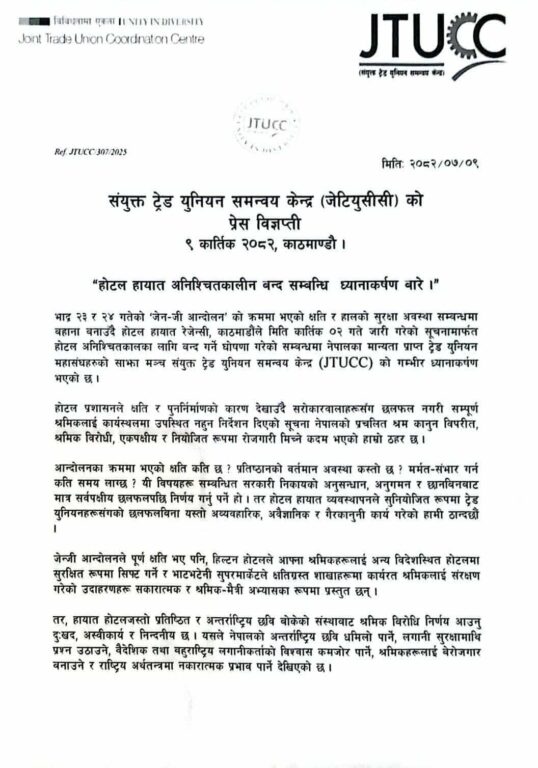 हायात होटल बन्द गर्ने निर्णयप्रति ट्रेड युनियन समन्वय केन्द्रको आपत्ति