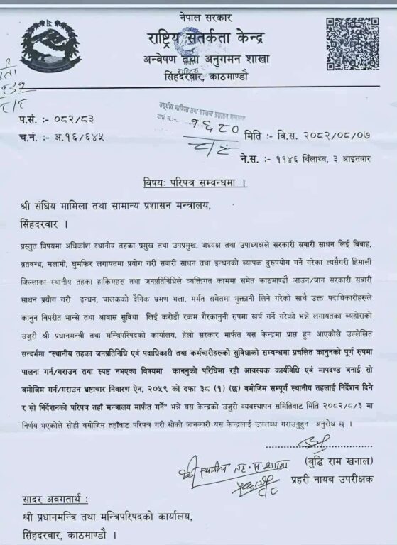 काठमाडौं– राष्ट्रिय सतर्कता केन्द्रले देशभरका स्थानीय तहमा भइरहेको सरकारी सवारी साधन दुरुपयोग रोक्न पत्र काटेको छ।