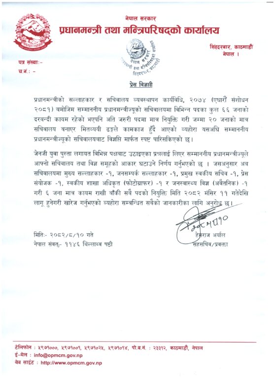 अब प्रधानमन्त्रीको सचिवालयमा मुख्य सल्लाहकार, जनसम्पर्क सल्लाहकार, प्रमुख स्वकीय सचिव, प्रेस संयोजक, फोटोग्राफर र जनस्वास्थ्य विज्ञ मात्र रहने छन्। ६ जनाबाहेक बाँकी सबै पदको नियुक्ति मंसिर ११ गतेदेखि लागु हुनेगरी खारेज गरेको कार्यालयले जनाएको छ।