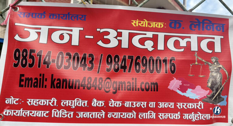 ‘जनअदालत’का नाममा टाँगिएको उक्त ब्यानरमा नोटमा लेखिएको छ, ‘सहकारी, लघुवित्त, बैंक, चेक बाउन्स वा अन्य सरकारी कार्यालयबाट पीडित जनताले न्यायको लागि सम्पर्क गर्नुहोला ।’