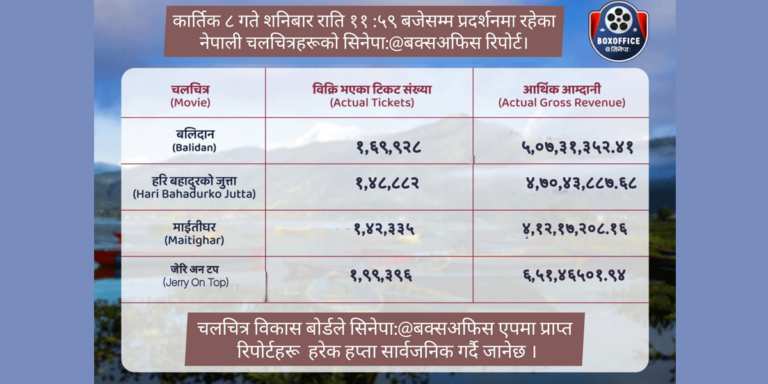 बोर्डले दशैँमा प्रदर्शनमा आएका तीन फिल्म ‘बलिदान’, ‘हरिबहादुरको जुत्ता’ र ‘माइतीघर’को समेत बक्स अफिस रिपोर्ट सार्वजनिक गरेको छ ।
