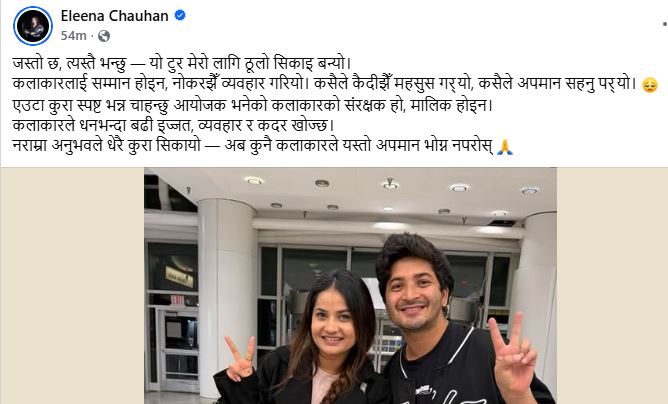 ‘जस्तो छ, त्यस्तै भन्छु — यो टुर मेरो लागि ठूलो सिकाइ बन्यो। कलाकारलाई सम्मान होइन, नोकरझैँ व्यवहार गरियो। कसैले कैदीझैँ महसुस ग¥यो, कसैले अपमान सहनु प¥यो,’ उनले भनेकी छन्, ‘एउटा कुरा स्पष्ट भन्न चाहन्छु आयोजक भनेको कलाकारको संरक्षक हो, मालिक होइन।’