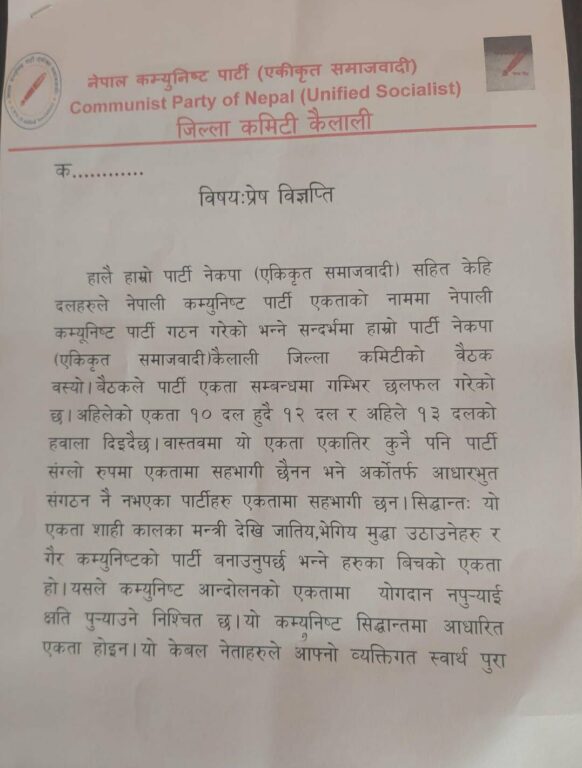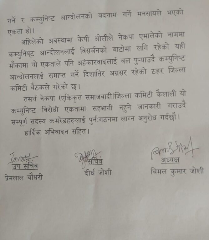 धनगढी– तत्कालीन माधवकुमार नेपाल नेतृत्वको नेकपा (एकीकृत समाजवादी) को कैलाली जिल्ला कमिटीका अध्यक्ष र सचिवसहितको बहुमत कमिटी नेपाली कम्युनिस्ट पार्टीमा नजाने  भएको छ ।