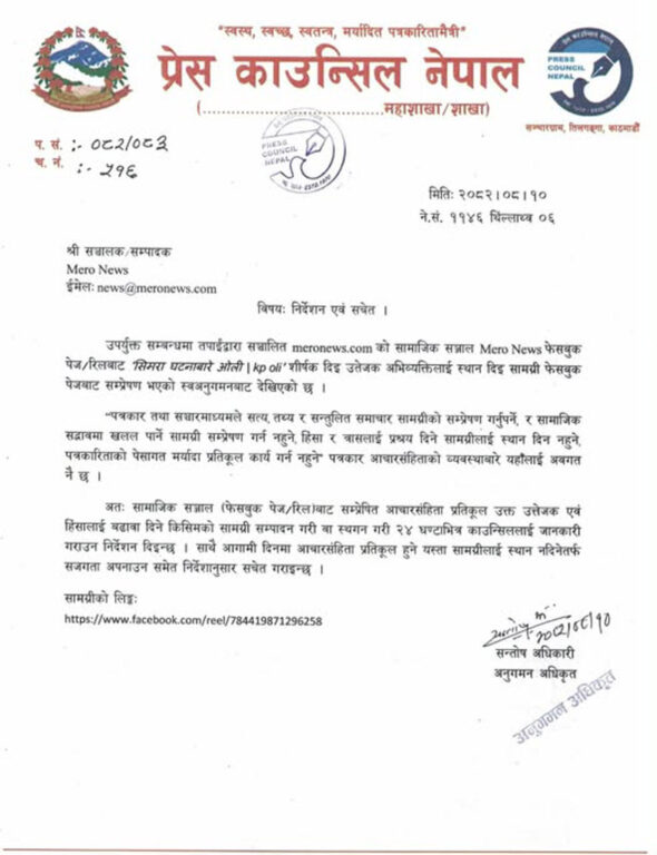 काउन्सिलका अनुगमन अधिकृत सन्तोष अधिकारीद्वारा जारी निर्देशनमा मेरो न्युज डटकमद्वारा सञ्चालित ‘मेरो न्युज फेसबुक पेज र रिल’मार्फत ‘ओली केपी ओली’ शीर्षकमा उत्तेजना फैल्याउने सामग्री प्रसारण भएको स्वअनुगमनबाट देखिएको उल्लेख छ।