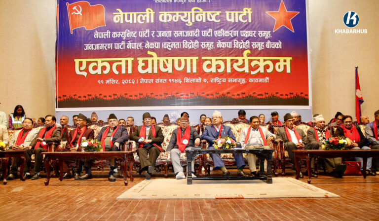 काठमाडौं– नेपाली कम्युनिष्ट पार्टी र जनता समाजवादी पार्टी एकिकरण पक्षधर समूह, जनजागरण पार्टी नेपाल, नेकपा बहुमत विद्रोही समूह र नेकपा (माओवादी) विद्रोही समूहबिचको एकता घोषणा कार्यक्रम शुरू भएको छ ।