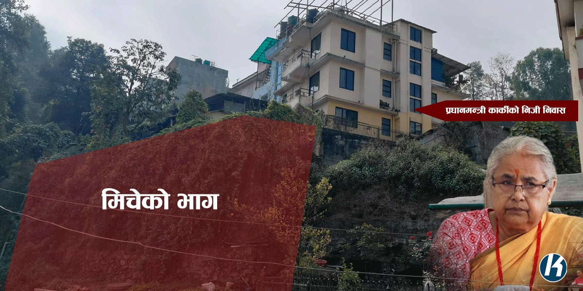 कार्कीको घरभन्दा तल अर्को घर छ, जुन घर तलतिरको समथर भागसम्म जोडिएको छ । तर, प्रधानमन्त्री कार्कीको घरबाट समथर भागसम्म जोड्ने बीचको भिरालो टुक्रो भने सार्वजनिक जग्गा हो । जुन जग्गामा पर्खाल उठाएर कार्कीको परिवारले प्रयोग गरेको स्थलगत रिर्पोटिङका क्रममा देखिएको छ । मिचिएको त्यो सार्वजनिक जग्गामा टिनले छाएको घर पनि कार्की परिवारले बनाएको छ ।