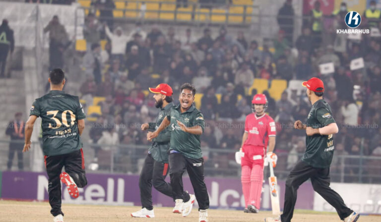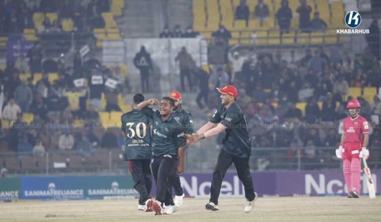 चौथो विकेटका रुपमा माज सदाकत २० रन जोडेर आउट भए । उनी पोखराका सुमीत वर्माको बलमा क्याच आउट भएका हुन् ।