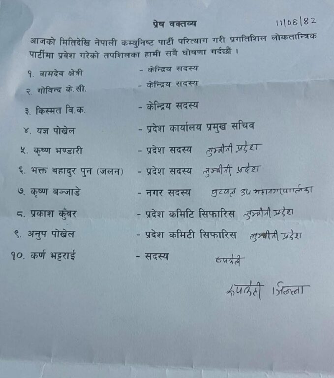 पार्टी त्याग गर्ने सूचीमा यज्ञ पोखेल (प्रदेश कार्यालय प्रमुख सचिव), कृष्ण भण्डारी (तुम्बीनी प्रदेश सदस्य), भक्त बहादुर पुन ‘जलन’ (लुम्बिनी प्रदेश सदस्य), कृष्ण बञ्जाडे (बुटवल उपमहानगरपालिका नगर सदस्य), प्रकाश कुँवर (लुम्बिनी प्रदेश कमिटी सिफारिस), अनुप पोखेल (लुम्बिनी प्रदेश कमिटी सिफारिस) र रुपन्देहीका कर्ण भट्टराई (सदस्य) छन्।