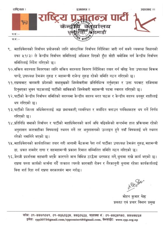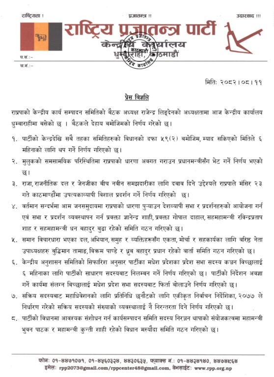 अध्यक्ष राजेन्द्र लिङ्देनको अध्यक्षतामा बिहीबार केन्द्रीय कार्यालय धुम्बाराहीमा बसेको बैठकले संगठन, आगामी कार्यक्रम र समसामयिक राजनीतिक परिस्थितिसम्बन्धी १६ बुँदे निर्णय पारित गरेको छ।