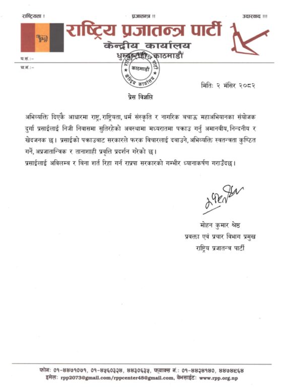 पार्टीले गैरकानुनी रूपमा थुनामा रहेका कार्यकर्तालाई तुरुन्त रिहा गर्न सरकारसँग माग गरेको छ।