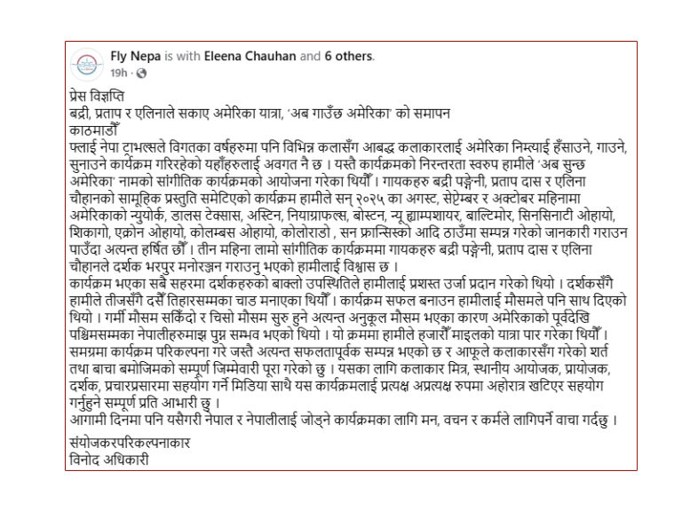 तीज, दशैँ र तिहार लक्षित संगीतिक टुरको आयोजक विनोद नेतृत्वको फ्लाई नेपालले आयोजना गरेको हो ।