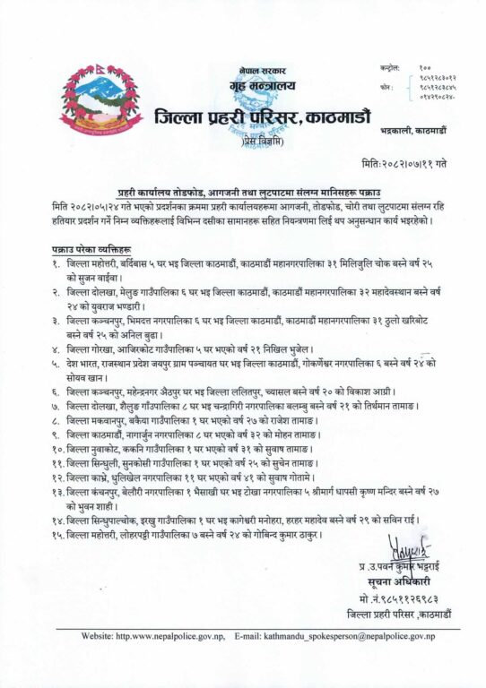 काठमाडौँ– जिल्ला प्रहरी परिसर काठमाडौँमा तोडफोड गर्ने १५ जना पक्राउ परेका छन्। भदौ २३ र २४ गते भएको जेनजी आन्दोलनको क्रममा जिल्ला प्रहरी परिसरसहित विभिन्न सरकारी कार्यालयहरु आगजनी र तोडफोड भएका थिए।