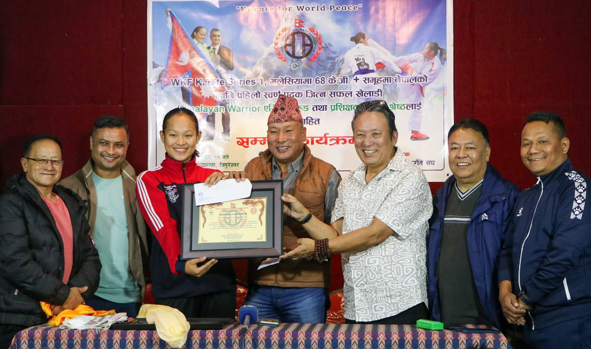 काठमाडौं- नेपाली राष्ट्रिय कराते खेलाडी एरिका गुरुङ र प्रशिक्षक कुशल श्रेष्ठलाई नगदसहित सम्मान गरिएको छ। मंगलबार नेपाल सितेरियो कराते संघले एक कार्यक्रमबीच एरिका र प्रशिक्षक श्रेष्ठलाई नगदसहित सम्मान गरेको हो।