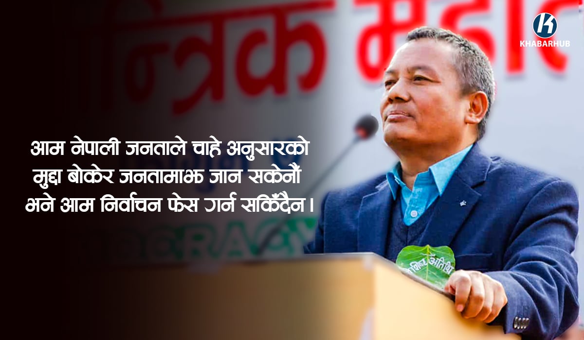 यथास्थितिमा निर्वाचनमा उहाँहरू त जानुहोला । हामी जान सकिँदैन, जाँदैनौ पनि । मैले त के भनेको छु भने यथास्थितिमा निर्वाचनमा जाने हो भने आफ्ना परिवारका सदस्य १ सय ६५ निर्वाचन क्षेत्रमा लड्न गए हुन्छ । यो अवस्थामा अरू कुनै पनि साथीभाइ कुनै पनि एजेण्डा लगेर निर्वाचनमा जाने अवस्था छैन । भदौ २३, २४ गतेको घटनालाई कमजोर सोचेर दुई दिन भयो अब सकियो भनेर कल्पना नगरे हुन्छ । हामीले नीतिगत सुधार गर्नुपर्छ । बोली, ब्यावहार रहन सहन सुधार गर्नुपर्छ । समग्र नेपाली जनताको इच्छा र आंकाक्षा अनुसार चल्नुपर्छ ।