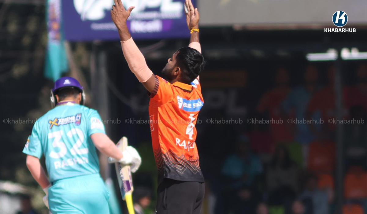 त्यसअघि काठमाडौंका तेस्रो क्रमका ब्याटर राशिद खान तेस्रो ओभरको पाँचौँ बलमा केबल ६ रन बनाएको अवस्थामा क्याच आउट हुन पुगे । उनी केबल एक छक्का हान्दै बाहिरिए ।