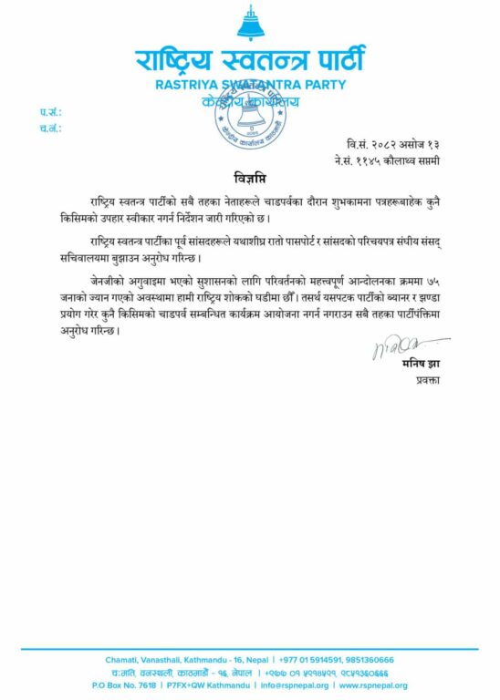 साथै रास्वपाले चाडपर्वका बेला शुभकामना पत्रहरूबाहेक कुनै किसिमको उपहार स्वीकार नगर्न नेताहरूलाई निर्देशन दिएको छ ।