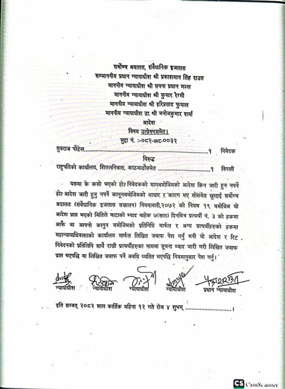 पौडेलको उक्त निर्णयविरुद्ध परेका १६ वटा रिटमाथि एकमुष्ट सुनुवाइका क्रममा विपक्षीका नाममा सात दिनभित्र कारण देखाऊ आदेश सर्वोच्चले दिएको हो ।