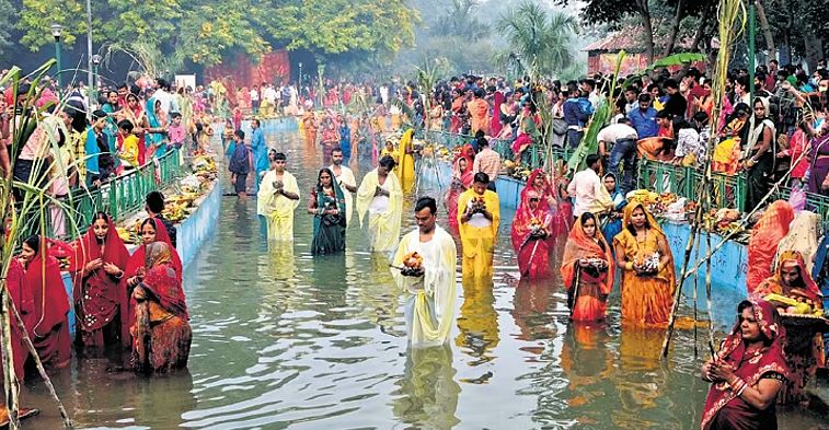 छठ पूजाको उत्सवको क्रममा सयौँ हिन्दु भक्तजनहरू नदी र पोखरीको पानीमा घुँडा टेकेर उभिने र डुबुल्की मार्ने गर्छन् ।