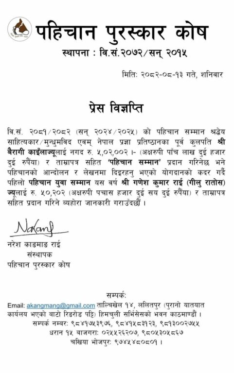 काठमाडौं– पहिचान पुरस्कार कोषले यस वर्षको पहिचान सम्मान साहित्यकार, मुन्धुमविद् तथा नेपाल प्रज्ञा प्रतिष्ठानका पूर्व कुलपति बैरागी काइँलालाई प्रदान गर्ने भएको छ।