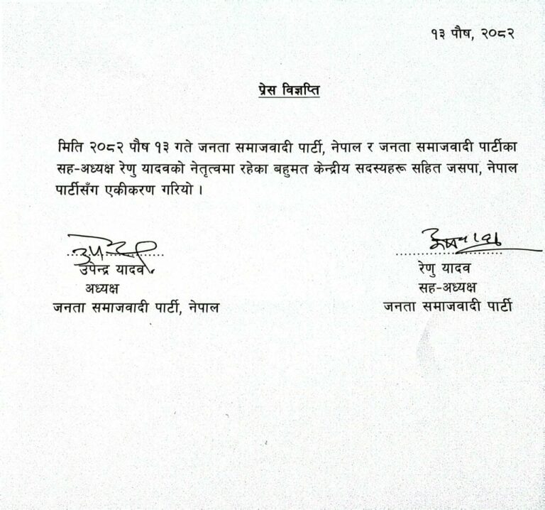 काठमाडौं– जनता समाजवादी पार्टी नेपालका अध्यक्ष उपेन्द्र यादव र जनता समाजवादी पार्टीका सहअध्यक्ष रेणु यादव पक्षबीच पार्टी एकताको सहमति भएको छ ।