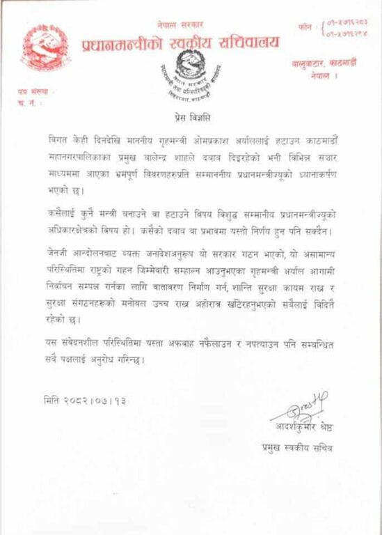 काठमाडौं– प्रधानमन्त्री सुशीला कार्कीको स्वकीय सचिवालयले गृहमन्त्री ओमप्रकाश अर्याललाई हटाउन काठमाडौं महानगरपालिकाका प्रमुख बालेन्द्र शाहले दबाब दिइरहेको भनी विभिन्न सञ्चार माध्यममा आएका समाचार भ्रमपूर्ण रहेको जनाएको छ ।