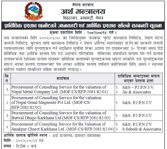 अर्थ मन्त्रालयले साउन २० गते आह्वान गरेको बोलपत्रमा सहभागी भएका मध्ये नेपाल मेटल कम्पनीको सम्पत्ति मूल्यांकनका लागि एस एन्ड एस– पिजेपिएन र जीन एन्ड एसोसिएट जेभी र नेपाल ओरिन्ड म्याग्नेसाइट प्रालिको लागि एस एन्ड एस– पिजेपिएन छनौट भएको अर्थ मन्त्रालयले जनाएको छ ।