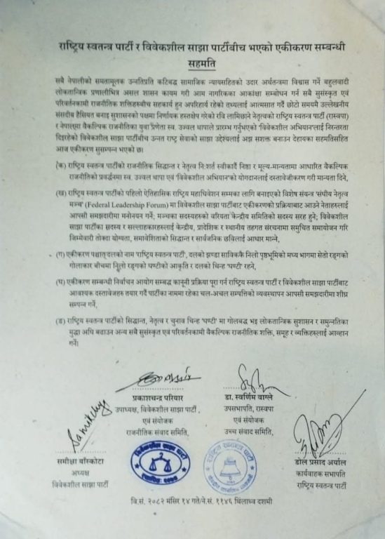 एकीकरणपत्रमा विवेकशील साझा पार्टीका अध्यक्ष समीक्षा वाँस्कोटा, उपाध्यक्ष प्रकाशचन्द्र परियार र रास्वपाका कार्यवाहक सभापति डोलप्रसाद अर्याल, उपसभापति डा. स्वर्णिम वाग्ले लगायतका नेतृत्वले हस्ताक्षर गरेका छन्।