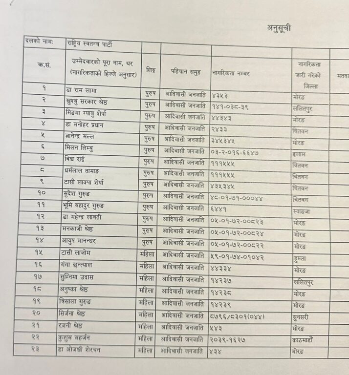 काठमाडौं– राष्ट्रिय स्वतन्त्र पार्टी (रास्वपा)ले समानुपातिकतर्फ ११० जनाको सूची निर्वाचन आयोगमा बुझाएको छ ।