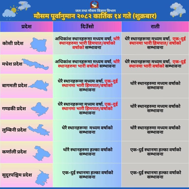 कोशी, बागमती र गण्डकी प्रदेशका उच्च पहाडी तथा हिमाली भूभागका एकदुई स्थानमा भारी हिमपात साथै कोशी र मधेश थोरै स्थानमा, गण्डकी प्रदेश र बागमती प्रदेशका एकदुई स्थानमा भारी वर्षाको सम्भावना रहेको छ।