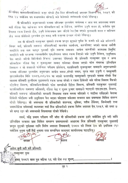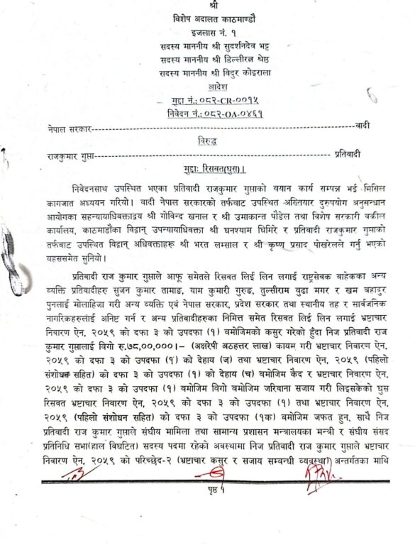अदालतका सदस्य सुदर्शनदेव भट्ट, डिल्लीरत्न श्रेष्ठ र विदुर कोइरालाको इजलासले अख्तियार दुरुपयोग अनुसन्धान आयोग तथा विशेष सरकारी वकिल कार्यालयका तर्फबाट प्रस्तुत प्रमाण, अडियो संवादको फरेन्सिक प्रतिवेदन, बैंक स्टेटमेन्ट, फोन सम्पर्क विवरण, एसएमएस र फोटोहरूलाई प्रारम्भिक रूपमा विश्वसनीय ठहर गरेको छ।